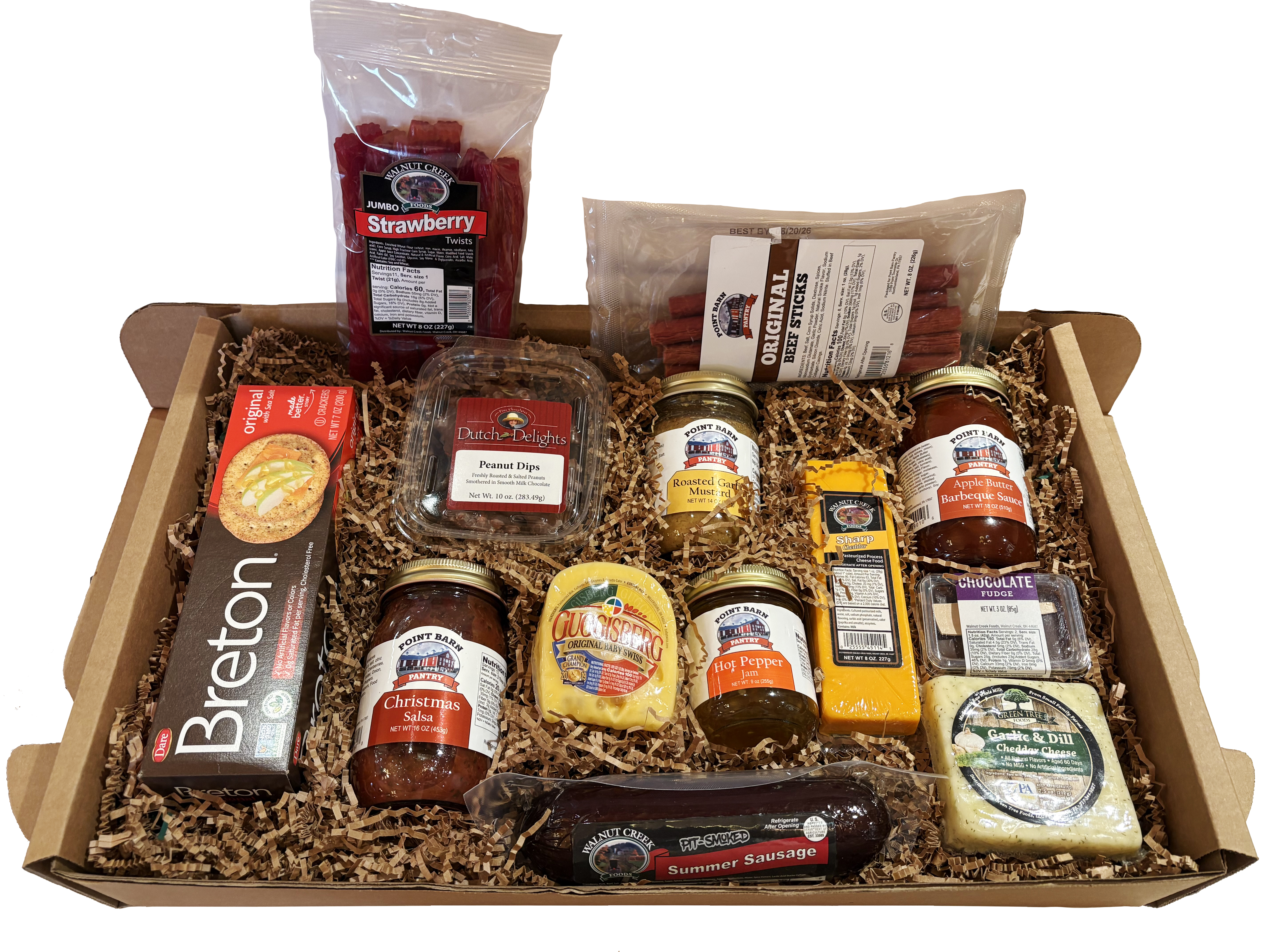 Choose from 16 gift box assortments. Call (570) 271-1710 to order. We do accept most major credit cards. We also can create gift baskets if you prefer a basket over a box. You can also create your own custom gift box or gift basket. If you would like to create a custom gift box or basket, fill your basket or box with whatever products you would like to include from any of the shops at the Point Barn. You may want a gift basket that includes wine, antiques, or textile products like a small quilt or handbag. You may want a gift box or basket with all types of soaps of which we have many. Once you have picked all the items you want included in your box or basket, we’ll wrap it all up for you with a bow.